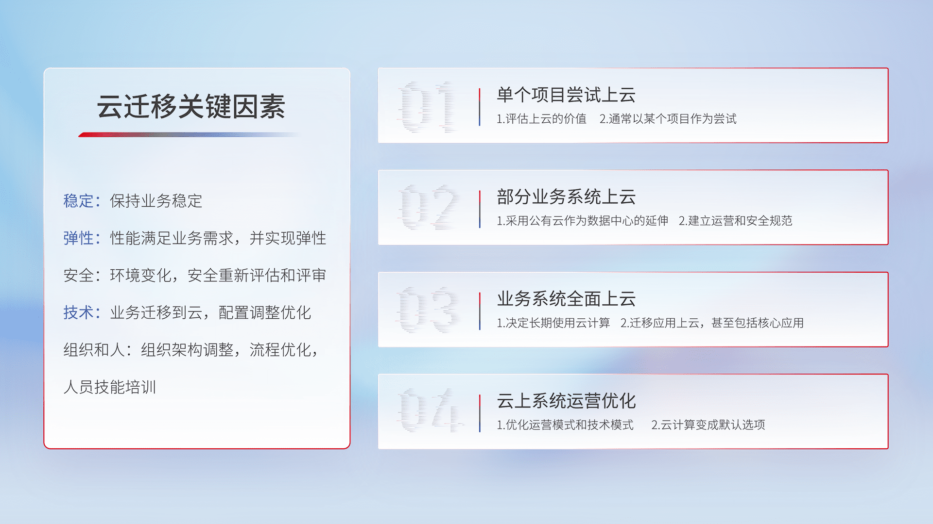 结合实际业务,,,,从规划设计、、、云平台选型、、、、云原生改造、、、数据迁移、、、集成交付,,,,迁移全过程为客户识别最佳上云路径,,,,做好风险识别管理,,,设计网络架构、、身份权限、、、安全审计合规、、操作审计、、、日志审计、、、、监控告警策略、、、、多站点容灾设计等,,对云上基础设施进行整体规划,,,提升IT治理水平,,以满足弹性、、、、高可用、、高性能的需求。。。。