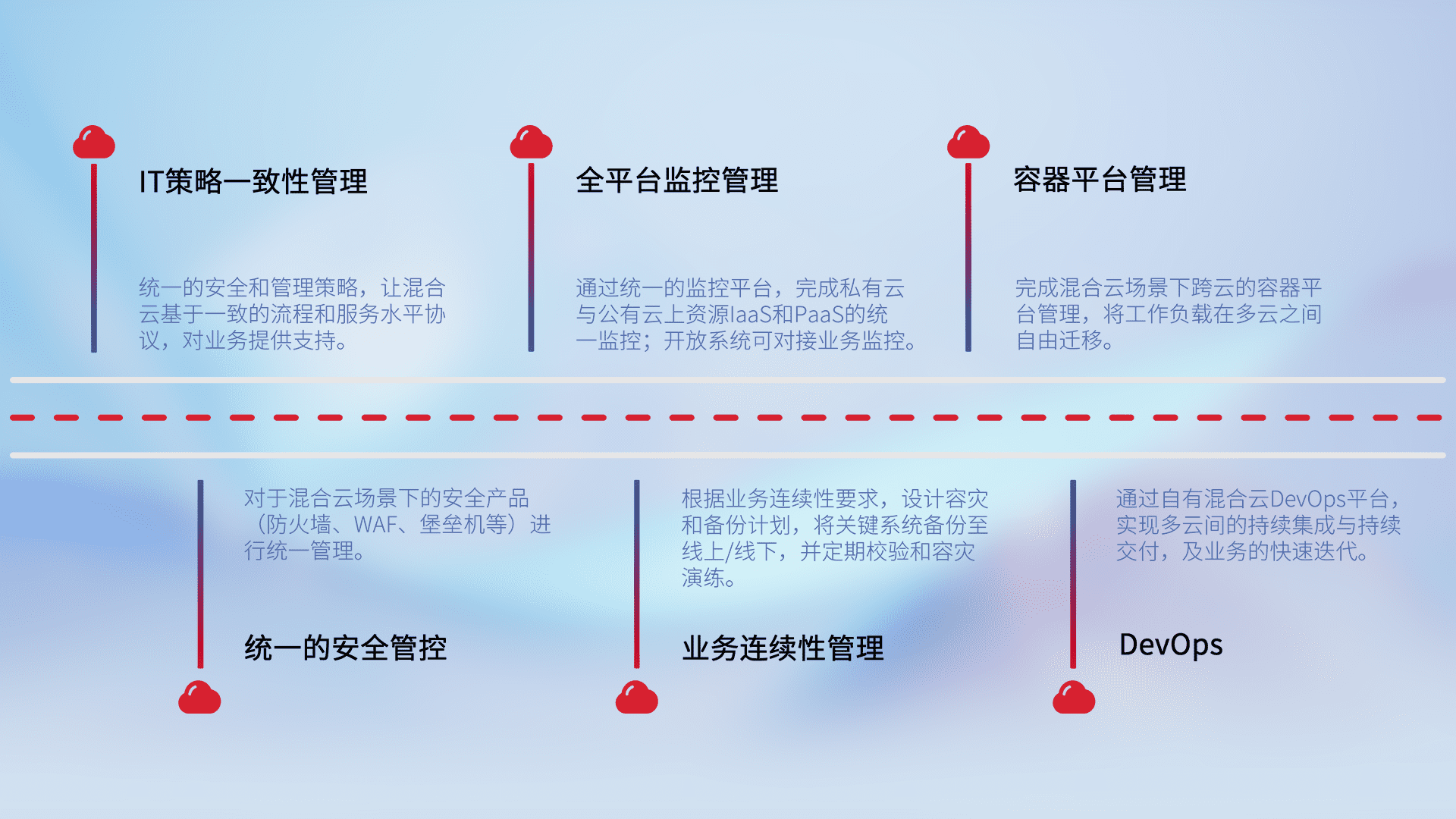 通过多云纳管,,,,以统一的资源数据模型把客户的云资源进行抽象和封装,,进而实现对多云资源的统一操作,,保障云资源管理的可靠性、、、、稳定性与可用性。。。。量身定制化运维内容,,配置、、开发运维、、补丁管理、、、、备份、、、监控、、、、认证和访问管理、、审计和日常巡检等,,保障在用云过程中的可靠度,,稳定度以及高可用率。。