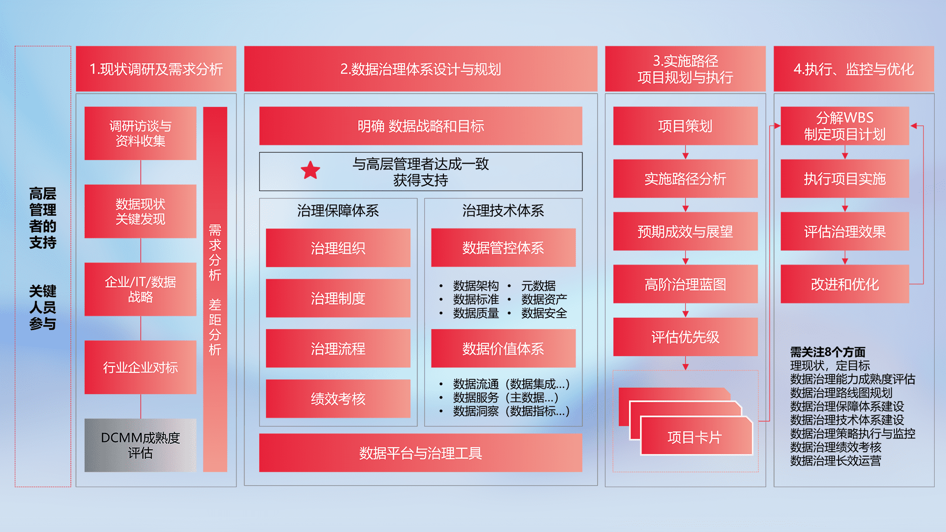 制定并执行统一的数据标准,,,,规范数据定义和格式,,,消除冗余和不一致性,,,实现跨部门和跨系统的数据一致性,,,为企业提供标准化的数据基础。。
